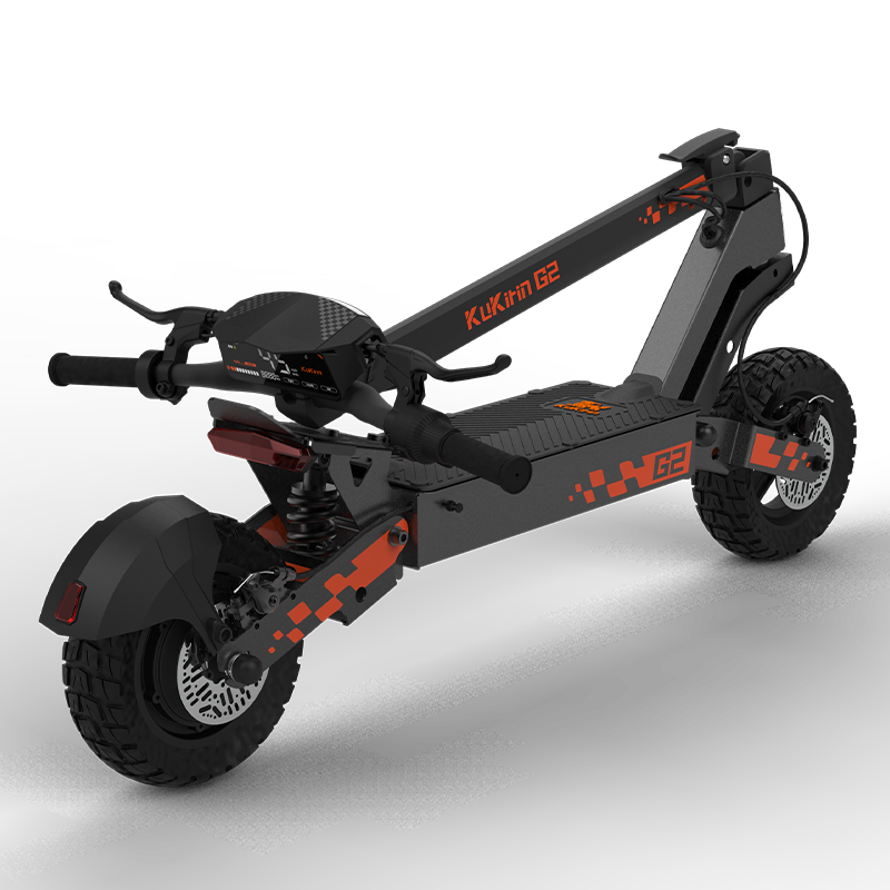 The KuKirin G2 is equipped with 10-inch off-road vacuum tires and front and rear spring dampers, whose excellent grip and shock absorption ensure a smooth ride in all road conditions. The design of the vacuum tires reduces the risk of flat tires and increases driving safety and comfort. Whether it's on city tarmac or gravel trails in the countryside, the KuKirin G2 can handle it with ease, providing you with an unparalleled riding experience.